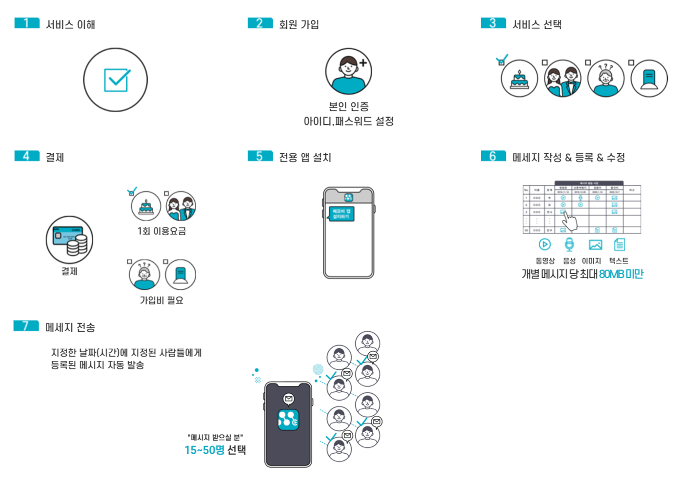 - 유지고객에 한해 서비스 제공 - 초대자 수, 이벤트 수, 이용 기간은 항목별로 추가 구매 가능 - 개별 메시지 용량은 80Mb 미만 |